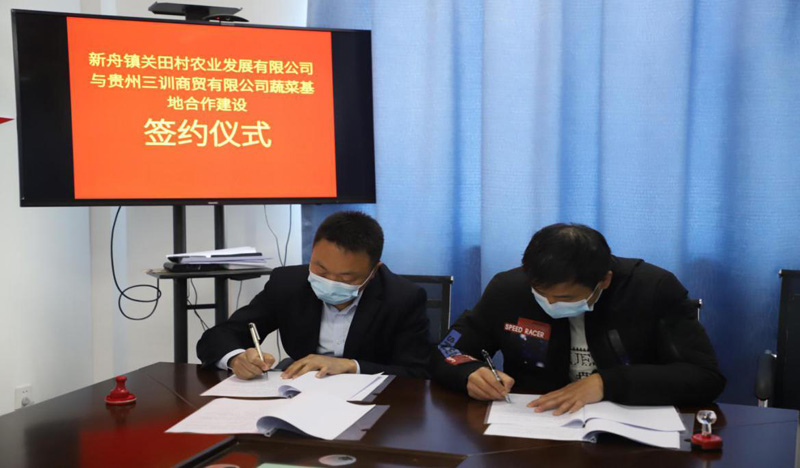 根據(jù)公司發(fā)展生態(tài)農業(yè)戰(zhàn)略部署,結合貴州省遵義市新蒲新區(qū)新舟鎮(zhèn)關田村鞏固脫貧攻堅成果工作計劃,經(jīng)公司與關田村村委會多次溝通協(xié)商,本著“因地制宜、特色產業(yè)、長遠規(guī)劃、合作共贏”原則,我公司旗下貴州三訓商貿有限公司和關田村村屬企業(yè)關田村農業(yè)發(fā)展有限公司就共同打造關田村種養(yǎng)基地(蔬菜種植、禽畜養(yǎng)殖)事宜達成一致協(xié)議。2020年4月22日上午在關田村村委會會議室舉行簽約儀式。關田村村支書吳應軍、主任黃國、種植專家陳明剛出席簽約儀式,總公司股東代表羅仕銀、貴州三訓商貿有限公司負責人王訓強、貴州陟翔保安有限公司遵義分公司負責人羅曉明參加簽約儀式。吳應軍與王訓強分別代表雙方簽署合作協(xié)議。