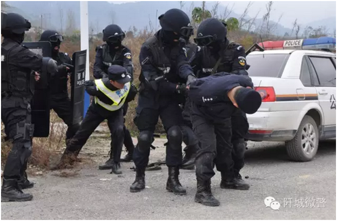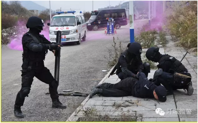 在演練現(xiàn)場,2名喬裝成警察的“歹徒”在通往一鄉(xiāng)鎮(zhèn)的公路上設(shè)卡,借口例行檢查,持槍對一輛有“鎮(zhèn)東護運”字樣的運鈔車實施“搶劫”,在與押運人員交談中,不料卻被押運人員識破其“詭計”,2名“歹徒”原形畢露,立即開槍射擊,就在這一瞬間,押運人員依法開槍將其中一名“歹徒”“擊傷”并迅速駕車至安全區(qū)域。同時,電話向警方報警求助。隨后,警方快速集結(jié)特警、巡警等30余名警力前往處置,通過喊話和政策攻心,2名“歹徒”仍然負隅頑抗,并向特警開槍。在勸說無效的情況下,指揮員下達對持槍“歹徒”采取強制措施的命令。歷時8分鐘,特警成功將2名“歹徒”制服并抓獲,隨即在醫(yī)護人員的幫助下,將“受傷”“歹徒”抬上救護車,送往醫(yī)院……