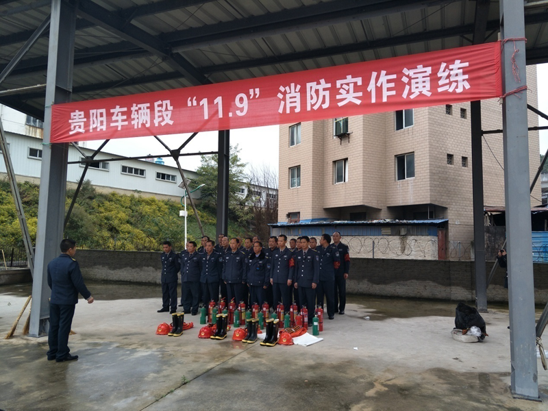 二、為切實(shí)加強(qiáng)我隊(duì)保安員消防安全意識,增強(qiáng)防范、撲救火災(zāi)和逃生自救能力,按照“決戰(zhàn)四季度全力保平安”消防工作要求,結(jié)合我隊(duì)實(shí)際,于2016年11月9日14:30在后巢客車整備所和貴陽北動車所同時開展“11.9”消防實(shí)作演練,駐車輛段、客運(yùn)段保安隊(duì)27人,駐車輛段動車所保安隊(duì)26人參加演練,客戶單位80余人到場觀摩學(xué)習(xí),并由保安隊(duì)隊(duì)長進(jìn)行教學(xué)演練。