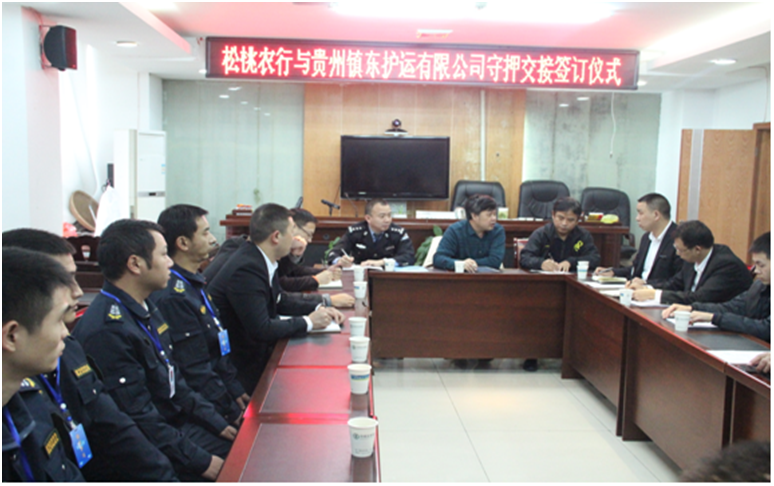 經(jīng)過半年的業(yè)務(wù)對(duì)接和洽談,銅仁本部于11月16日至20日正式接手德江、石阡、印江、江口、松桃五縣農(nóng)業(yè)銀行守押業(yè)務(wù)。銅仁市公安局保安大隊(duì)大隊(duì)長王世軍、銅仁市農(nóng)行副行長任達(dá)輝、銅仁市農(nóng)行保衛(wèi)部經(jīng)理?xiàng)蠲、銅仁本部總經(jīng)理陳葉、副總經(jīng)理劉興華、劉樹等出席了五縣守押業(yè)務(wù)交接儀式。